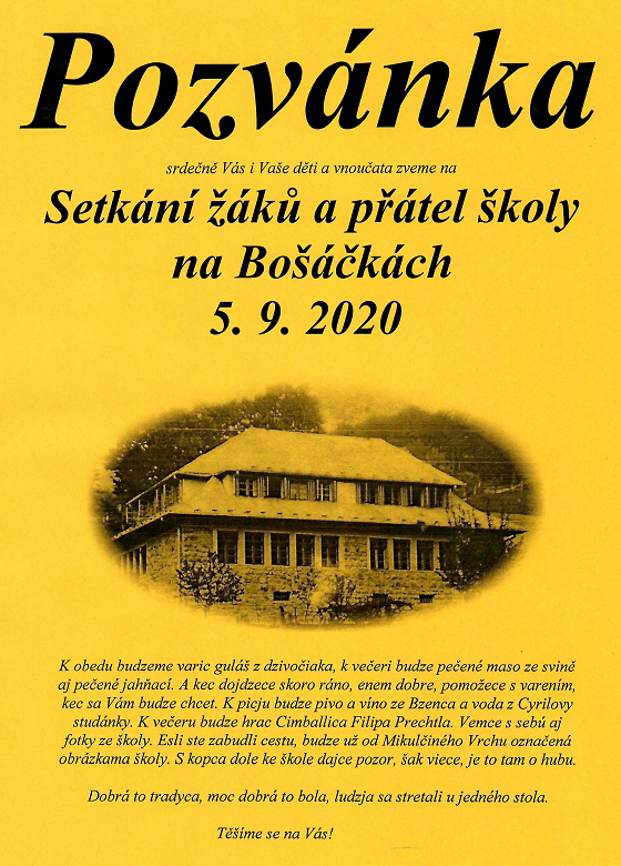 ArchivVyvěšeno dne: 31.8.202017.9.2020Obecní úřad Pozvánka | Sňato dne: 17. 09. 2020 Pozvánka – Setkání žáků a přátel školy na Bošáčkách 5.9.2020